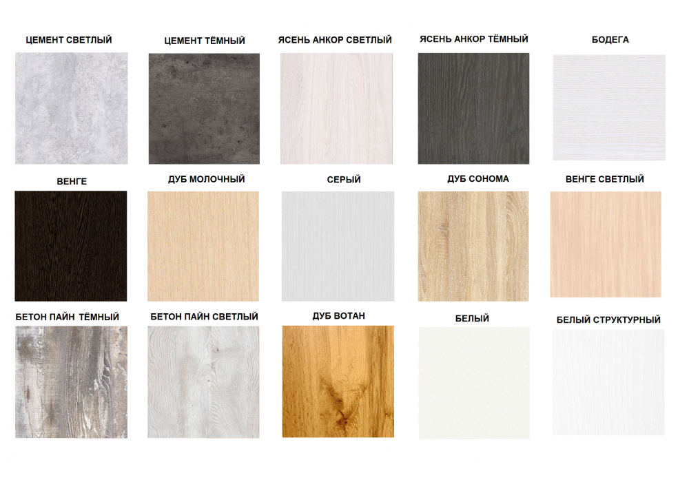 Стандартные цвета:  дуб сонома, ясень шимо тёмный, ясень шимо светлый,  яблоня, орех лесной, ольха, бук, венге темный, орех темный, дуб молочный, светлый венге,  белый  гладкий